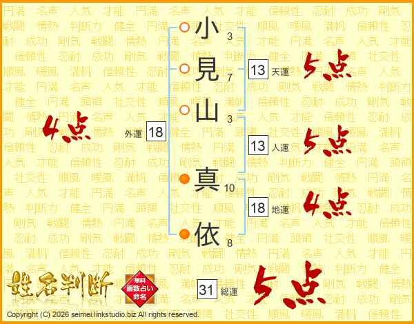 小(3画)見(7画)山(3画) 真(10画)依(8画)