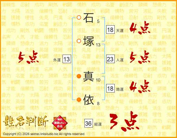 石(5画)塚(13画) 真(10画)依(8画)