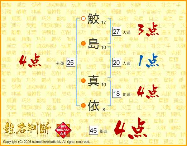 鮫(17画)島(10画) 真(10画)依(8画)