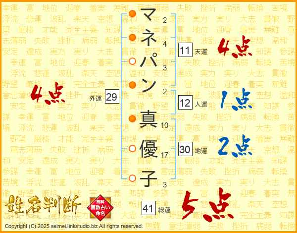 マ(2画)ネ(4画)パ(3画)ン(2画) 真(10画)優(17画)子(3画)