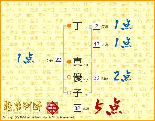 生活面を象徴する運勢です。外部から受ける影響力を表し、結婚運、家庭運や職場、環境への順応性を表します。総運から人運を引いた画数。姓や名が1文字の場合を除く。