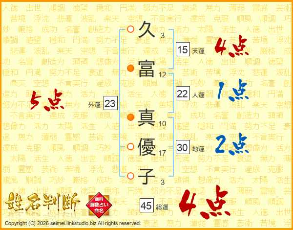 久(3画)富(12画) 真(10画)優(17画)子(3画)