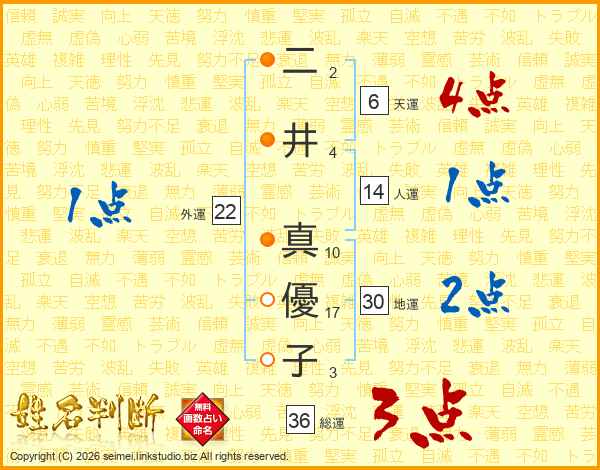 二(2画)井(4画) 真(10画)優(17画)子(3画)