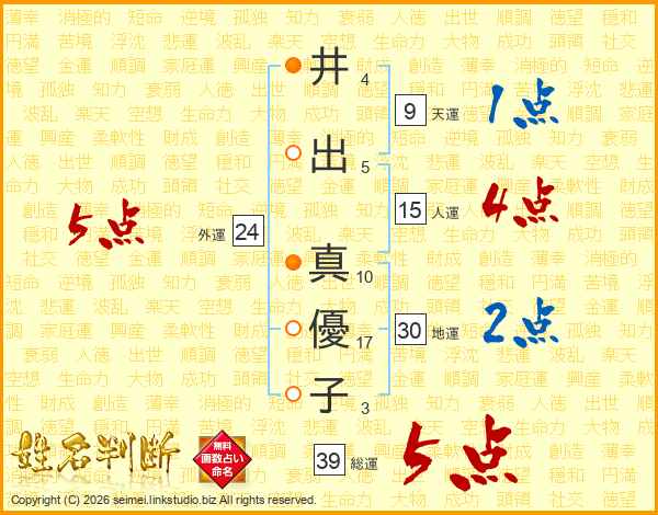 井(4画)出(5画) 真(10画)優(17画)子(3画)