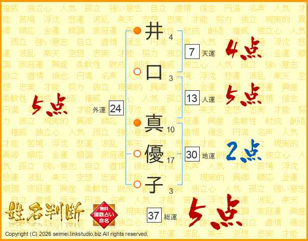 井口真優子さんの総運は37画の5点!