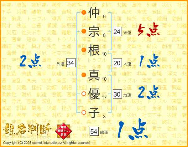 仲(6画)宗(8画)根(10画) 真(10画)優(17画)子(3画)