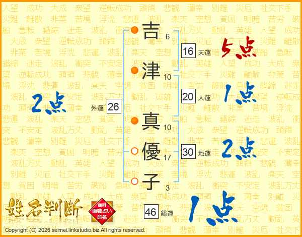 吉(6画)津(10画) 真(10画)優(17画)子(3画)
