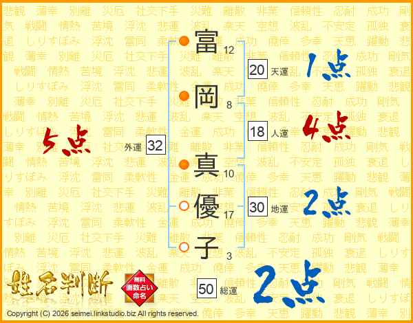 富岡真優子さんの外運は32画の5点!
