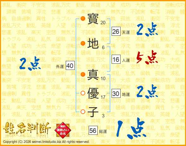 寳(20画)地(6画) 真(10画)優(17画)子(3画)