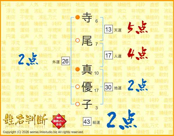 寺(6画)尾(7画) 真(10画)優(17画)子(3画)