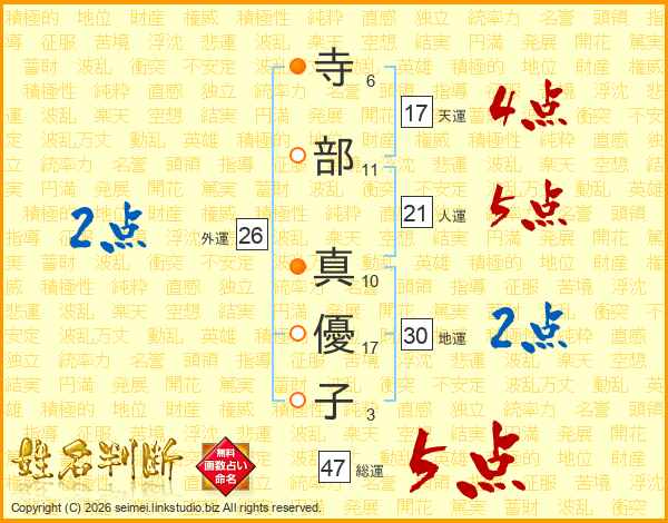 寺(6画)部(11画) 真(10画)優(17画)子(3画)
