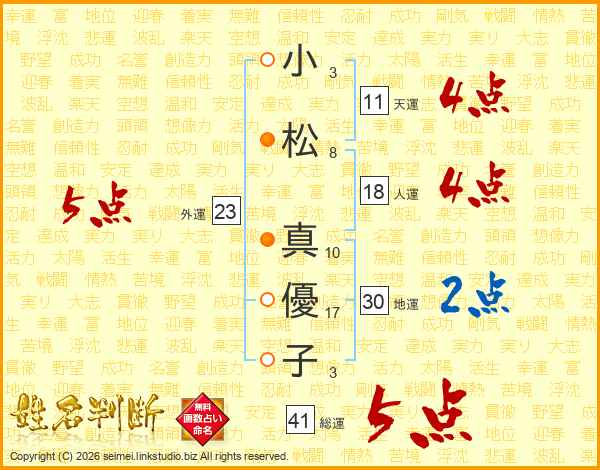 小(3画)松(8画) 真(10画)優(17画)子(3画)