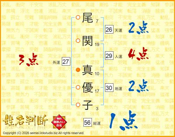 尾(7画)関(19画) 真(10画)優(17画)子(3画)