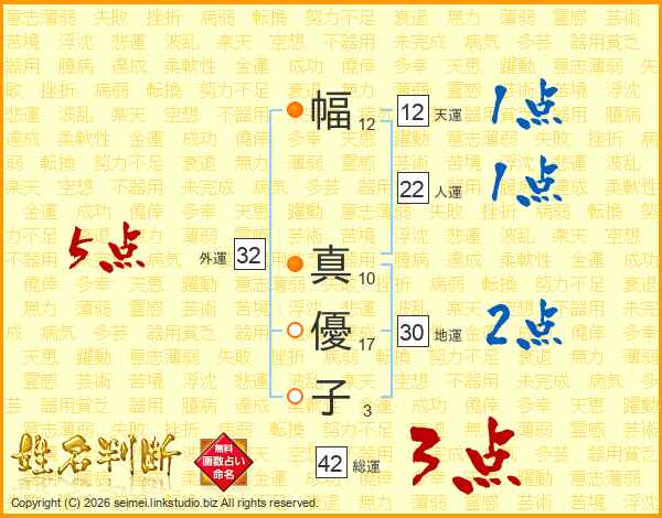 幅(12画) 真(10画)優(17画)子(3画)