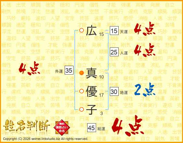 広(15画) 真(10画)優(17画)子(3画)