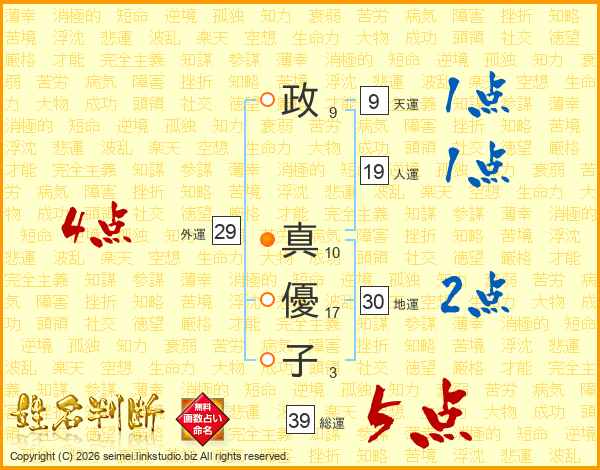 あなたの人生を表す1番重要な運勢です。生涯を通じて影響する総合運となり、主に50歳以降の晩年期に影響を及ぼします。苗字と名前の合計画数。