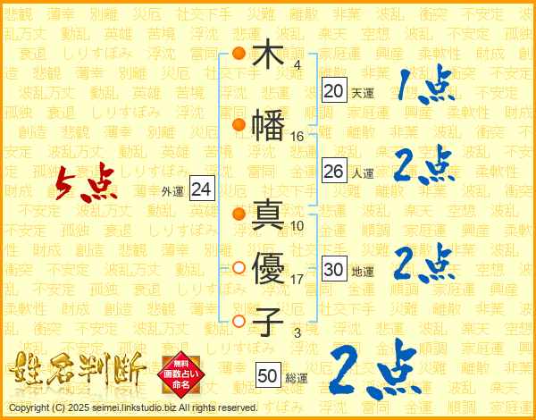 木(4画)幡(16画) 真(10画)優(17画)子(3画)