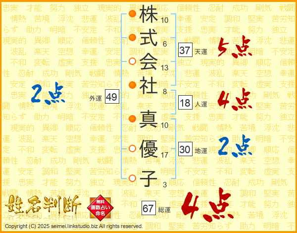株(10画)式(6画)会(13画)社(8画) 真(10画)優(17画)子(3画)