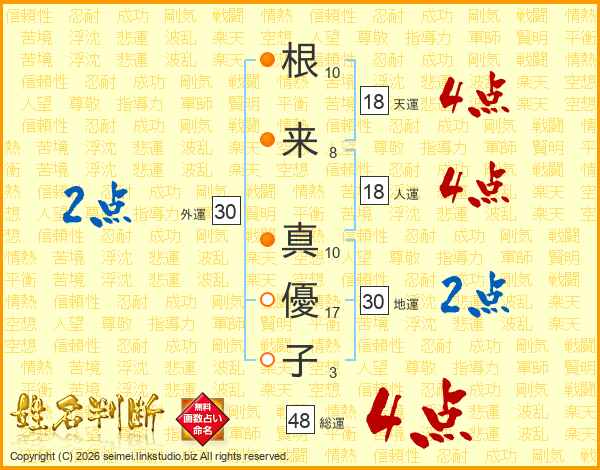 根(10画)来(8画) 真(10画)優(17画)子(3画)