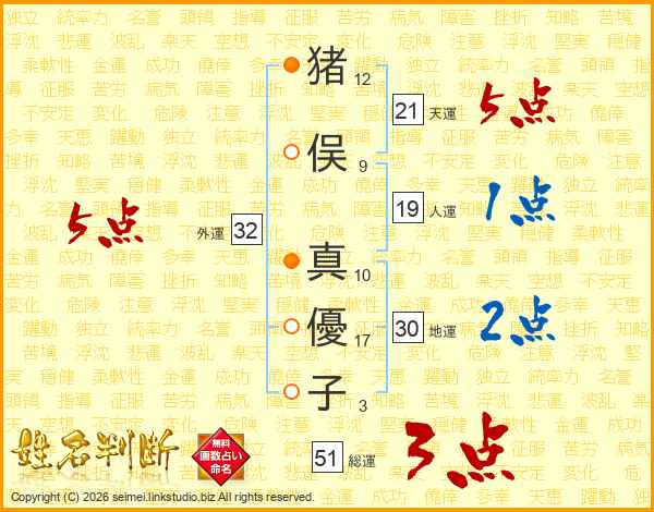 猪(12画)俣(9画) 真(10画)優(17画)子(3画)