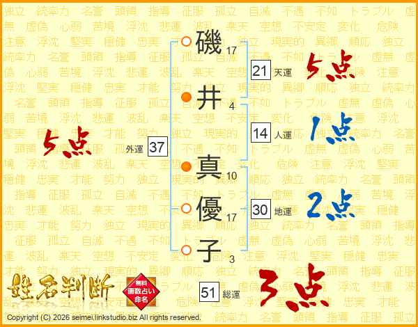 磯(17画)井(4画) 真(10画)優(17画)子(3画)