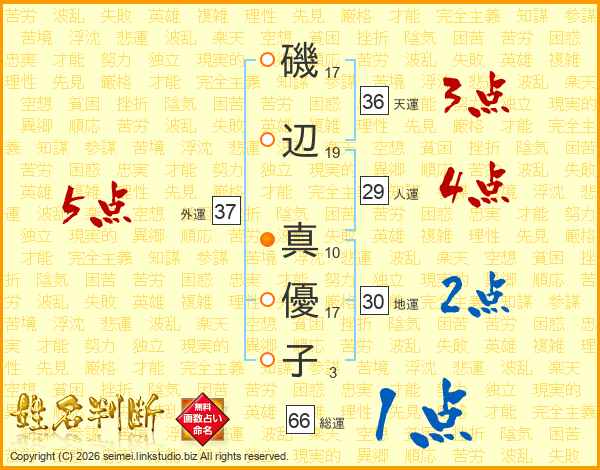 磯(17画)辺(19画) 真(10画)優(17画)子(3画)