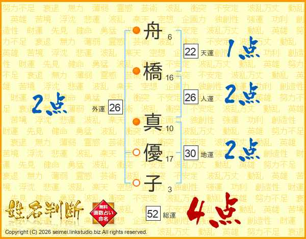 舟(6画)橋(16画) 真(10画)優(17画)子(3画)