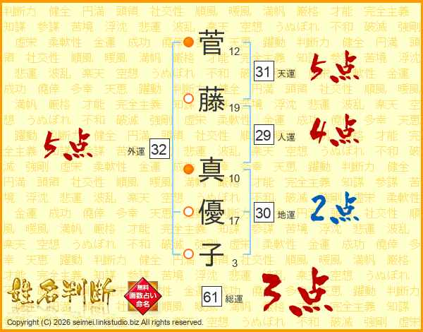 菅(12画)藤(19画) 真(10画)優(17画)子(3画)