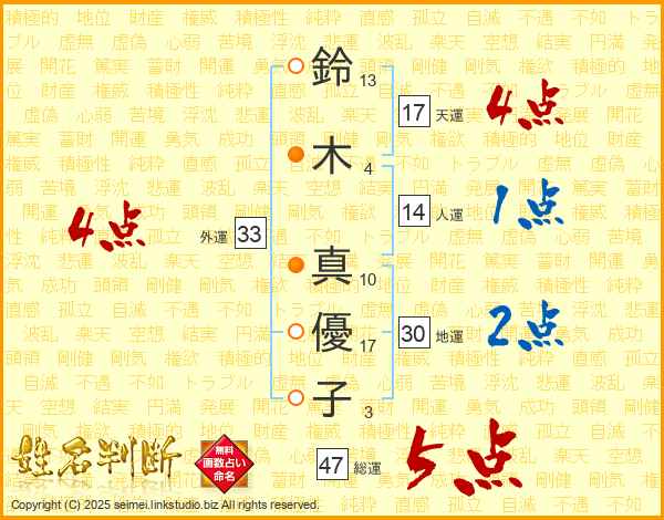 鈴(13画)木(4画) 真(10画)優(17画)子(3画)