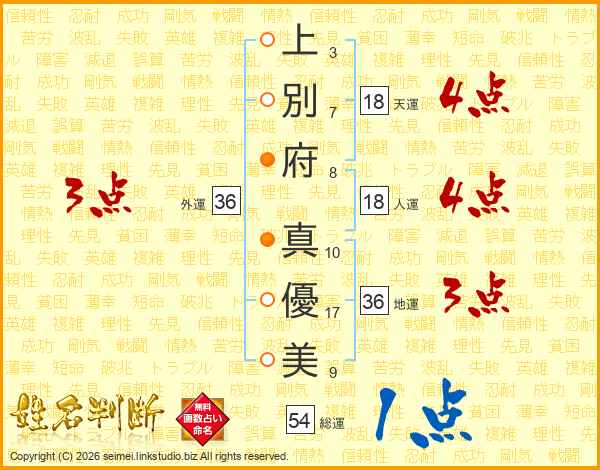 上(3画)別(7画)府(8画) 真(10画)優(17画)美(9画)