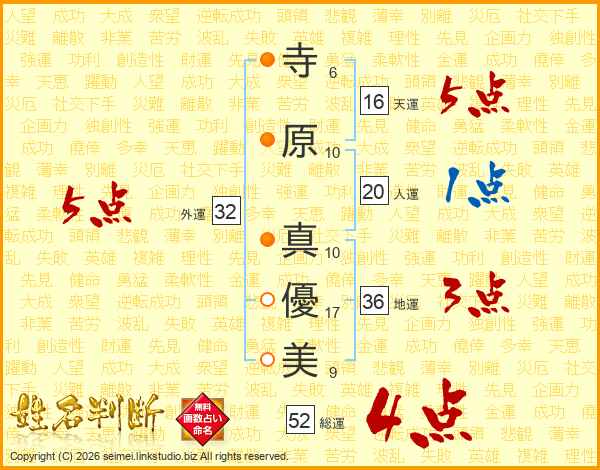寺(6画)原(10画) 真(10画)優(17画)美(9画)