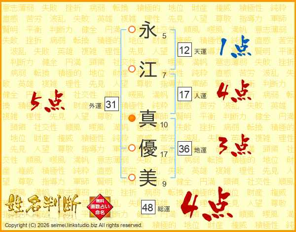 永(5画)江(7画) 真(10画)優(17画)美(9画)