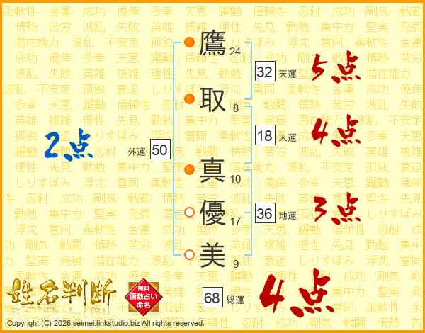 鷹(24画)取(8画) 真(10画)優(17画)美(9画)