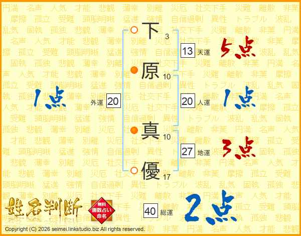 生活面を象徴する運勢です。外部から受ける影響力を表し、結婚運、家庭運や職場、環境への順応性を表します。総運から人運を引いた画数。姓や名が1文字の場合を除く。