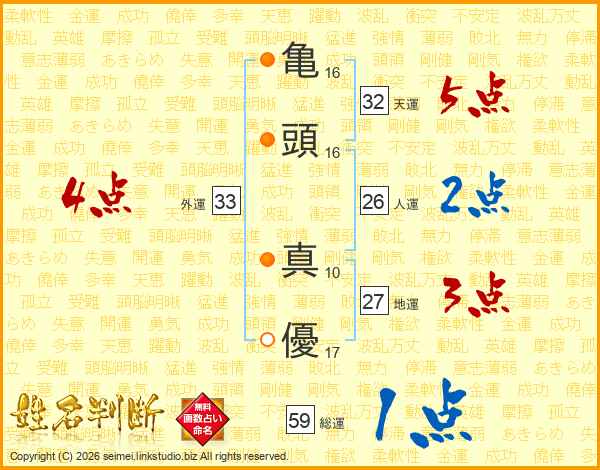 亀(16画)頭(16画) 真(10画)優(17画)