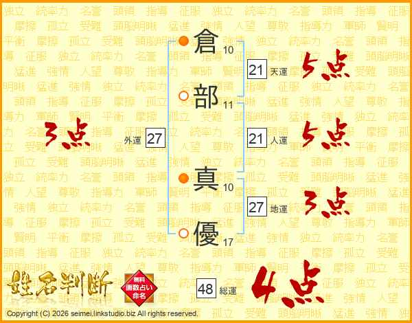倉(10画)部(11画) 真(10画)優(17画)
