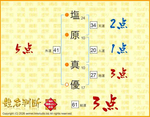 塩(24画)原(10画) 真(10画)優(17画)