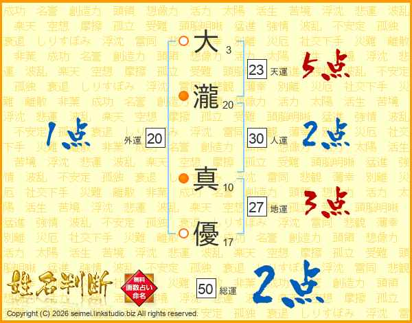 大(3画)瀧(20画) 真(10画)優(17画)