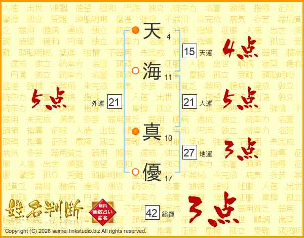 生活面を象徴する運勢です。外部から受ける影響力を表し、結婚運、家庭運や職場、環境への順応性を表します。総運から人運を引いた画数。姓や名が1文字の場合を除く。