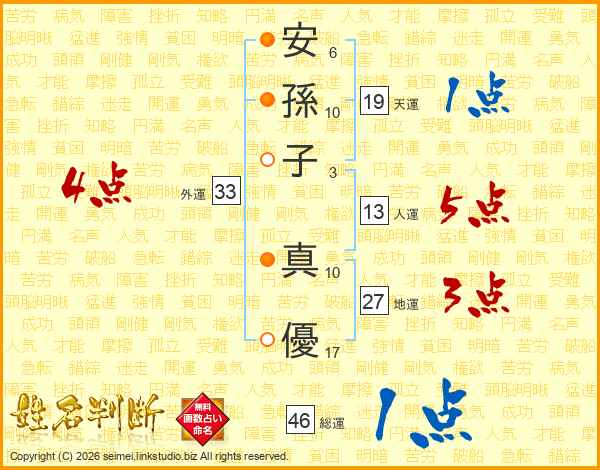 安(6画)孫(10画)子(3画) 真(10画)優(17画)