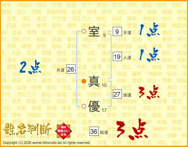 室(9画) 真(10画)優(17画)