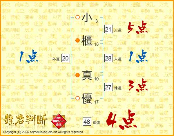 生活面を象徴する運勢です。外部から受ける影響力を表し、結婚運、家庭運や職場、環境への順応性を表します。総運から人運を引いた画数。姓や名が1文字の場合を除く。