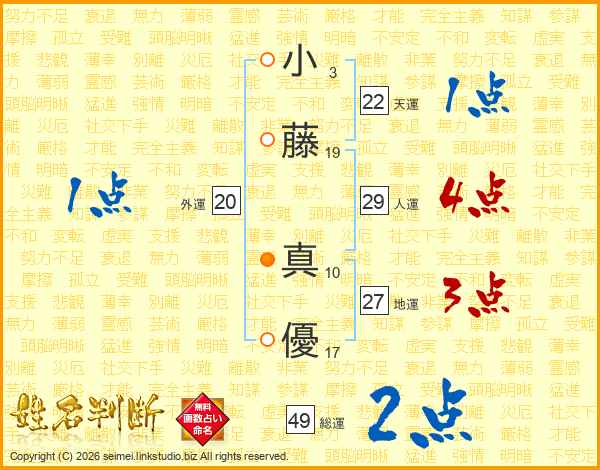 小(3画)藤(19画) 真(10画)優(17画)