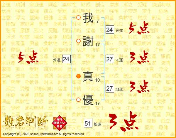 我(7画)謝(17画) 真(10画)優(17画)