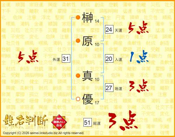 生活面を象徴する運勢です。外部から受ける影響力を表し、結婚運、家庭運や職場、環境への順応性を表します。総運から人運を引いた画数。姓や名が1文字の場合を除く。