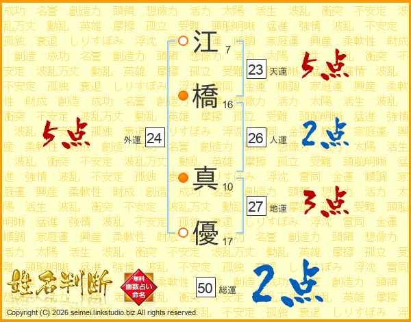 生活面を象徴する運勢です。外部から受ける影響力を表し、結婚運、家庭運や職場、環境への順応性を表します。総運から人運を引いた画数。姓や名が1文字の場合を除く。