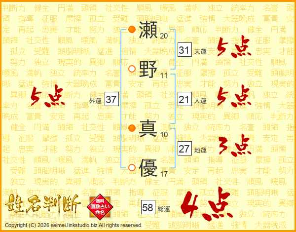 瀬野真優さんの総運は58画の4点!