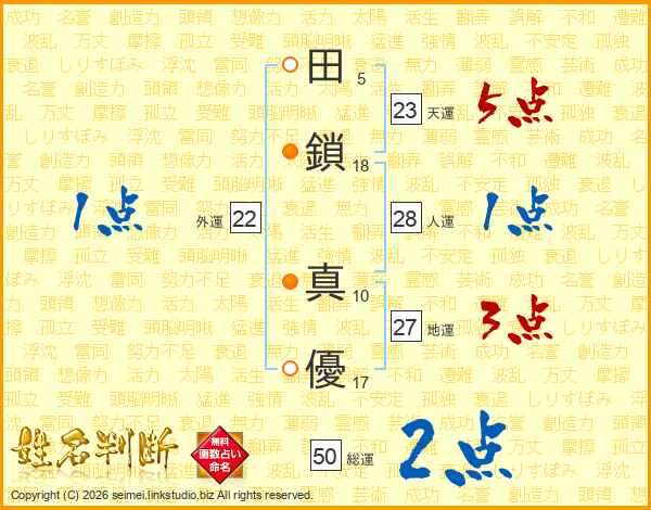 生活面を象徴する運勢です。外部から受ける影響力を表し、結婚運、家庭運や職場、環境への順応性を表します。総運から人運を引いた画数。姓や名が1文字の場合を除く。