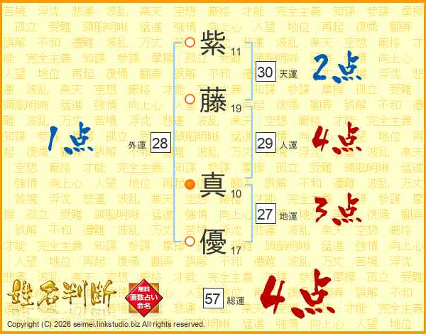 生活面を象徴する運勢です。外部から受ける影響力を表し、結婚運、家庭運や職場、環境への順応性を表します。総運から人運を引いた画数。姓や名が1文字の場合を除く。