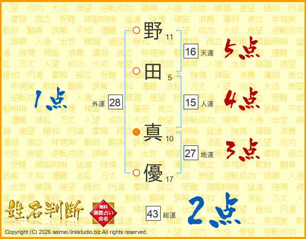 野(11画)田(5画) 真(10画)優(17画)